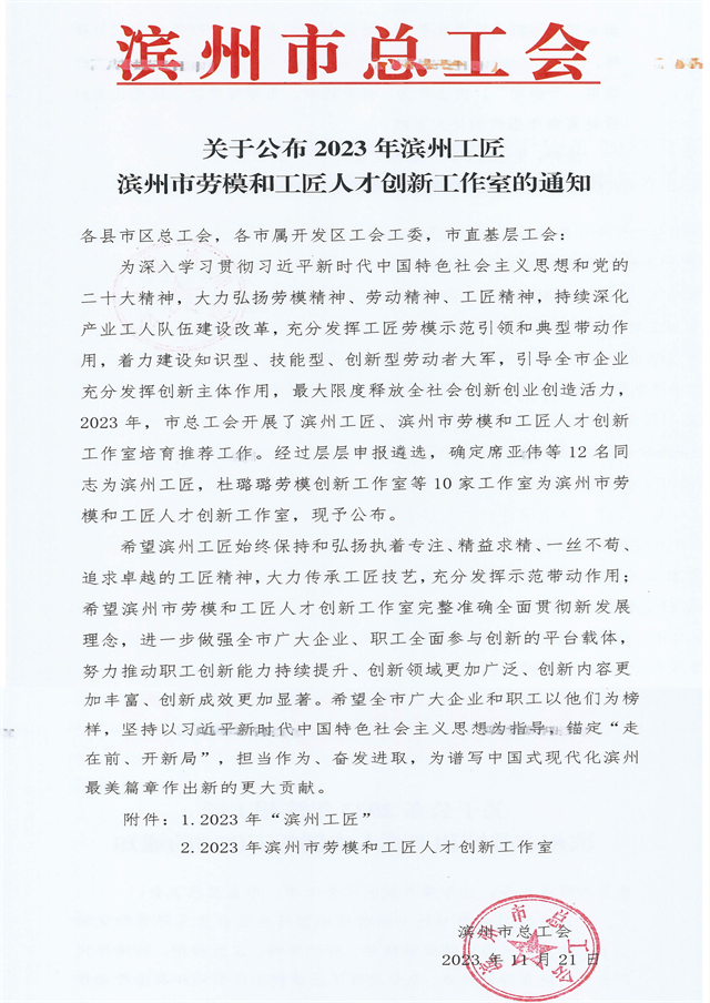 導(dǎo)讀:近日,濱州市總工會(huì)下發(fā)了《關(guān)于公布 2023 年濱州工匠濱州市勞模和工匠人才創(chuàng)新工作室的通知》,