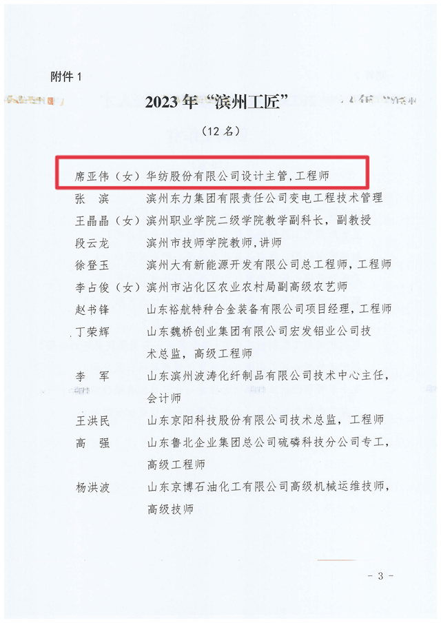 近日,濱州市總工會(huì)下發(fā)了《關(guān)于公布 2023 年濱州工匠濱州市勞模和工匠人才創(chuàng)新工作室的通知》,公司家紡研發(fā)部設(shè)計(jì)主管、工程師席亞偉榮獲2023年“濱州工匠”稱號、王魯剛工匠人才創(chuàng)新工作室榮獲“濱州市勞模和工匠人才創(chuàng)新工作室”榮譽(yù)。
