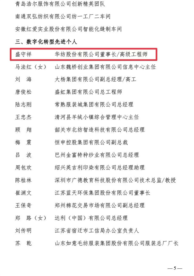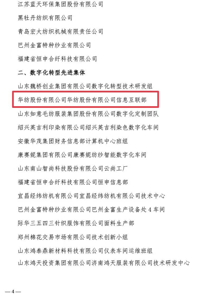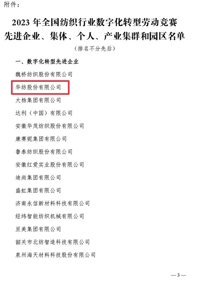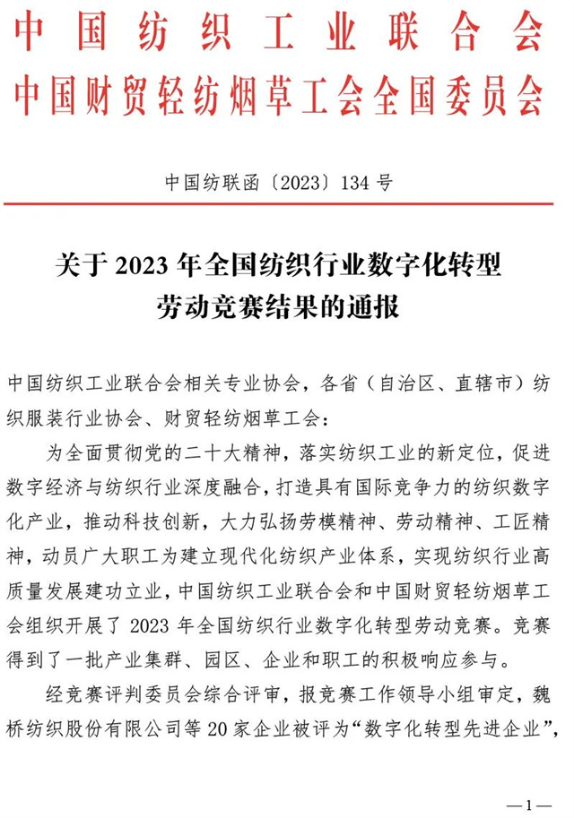 近日,中國紡織工業(yè)聯(lián)合會(huì)、中國財(cái)貿(mào)輕紡煙草工會(huì)全國委員會(huì)聯(lián)合發(fā)布了《關(guān)于2023年全國紡織行業(yè)數(shù)字化轉(zhuǎn)型勞動(dòng)競賽結(jié)果的通報(bào)》,公司憑借2023年在數(shù)字化轉(zhuǎn)型方面的不斷探索與創(chuàng)新被評為“數(shù)字化轉(zhuǎn)型先進(jìn)企業(yè)”,公司信息互聯(lián)部被評為“數(shù)字化轉(zhuǎn)型先進(jìn)集體”,公司黨委書記、董事長盛守祥先生被評為“數(shù)字化轉(zhuǎn)型先進(jìn)個(gè)人”。