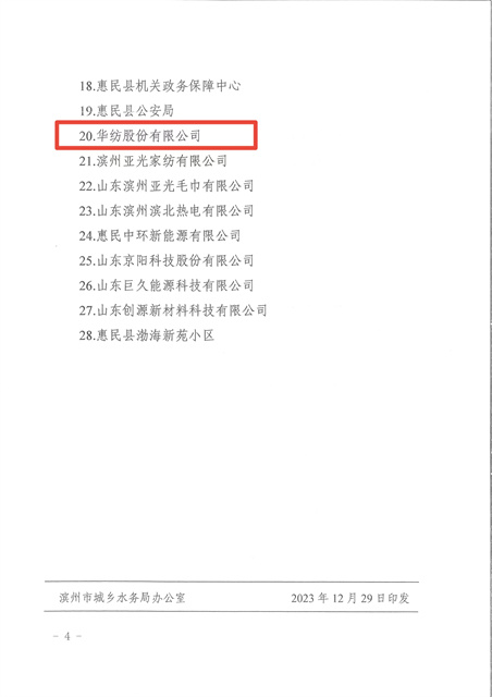 2023年,在全國紡織行業(yè)綠色發(fā)展勞動競賽中,公司榮獲節(jié)水標桿企業(yè);在濱州市創(chuàng)建國家節(jié)水型城市省級復查工作中,公司高質量、高標準完成各項工作任務,為順利通過省級復查奠定了基礎。